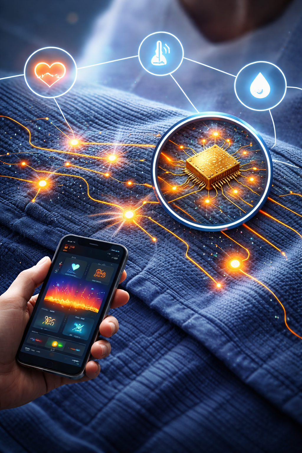 Integration von textilen Sensoren zur Erfassung und Übertragung von Daten in Echtzeit.